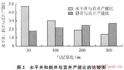 。水平井開發(fā)油氣藏要求兩個(gè)基本的適用條件:①油氣層不能太厚;②垂向滲透率不能太低。 綜合分析氣井的物性參數(shù),建立不同井型的投入產(chǎn)出計(jì)算模型,明確不同井型的開采效果。圖2是采用普光氣田實(shí)際儲(chǔ)層參數(shù)計(jì)算的不同厚度氣層條件下斜井和水平井同直井的產(chǎn)能比,這里斜井井斜角取75°,水平井水平段長度取600m,氣層垂向滲透率與水平滲透率之比取0.5。從圖2中可看出,對(duì)有效厚度小于100m的氣層,水平井相對(duì)直井的增產(chǎn)效果明顯好于大斜度井,其增產(chǎn)倍數(shù)是斜井的2倍。但對(duì)于有效厚度大于200m的氣層,大斜度井的開發(fā)效果好于水平井。