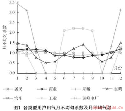 一般各類天然氣用戶用氣均具有以12個月為周期的季節(jié)性變化。特別是我國北方城市,如果在用氣結(jié)構(gòu)中采暖、熱電廠等用戶比例偏大,將造成月間用氣不均勻,季節(jié)調(diào)峰壓力大。隨著總用氣規(guī)模的增加,峰值負荷一旦在儲氣、調(diào)度方面不能解決,將造成部分用戶斷氣或限供,帶來負面的社會影響。