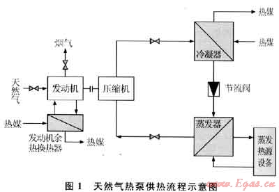 天然氣熱泵供熱的流程見圖1,主要設備有天然氣發(fā)動機、壓縮機、冷凝器、蒸發(fā)器、蒸發(fā)熱源設備以及利用發(fā)動機冷卻水的發(fā)動機余熱換熱器等。供熱回來的熱媒分別經熱泵冷凝器和發(fā)動機余熱換熱器換熱升溫并匯合后供給熱用戶。天然氣在發(fā)動機中燃燒后經絕熱膨脹做功和經發(fā)動機冷卻水冷卻后,煙氣溫度已不太高,但可用作蒸發(fā)器冬天除霜用,本文未考慮煙氣余熱的回收。
