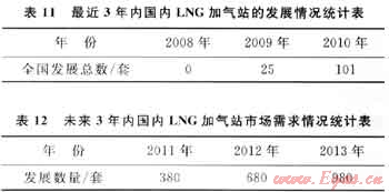 對LNG燃料汽車發(fā)展進度影響最大的是配套LNG加氣站的建設。目前,我國3大能源企業(yè)(中石油、中石化、中海油)及新疆廣匯、新奧燃氣、中國港華燃氣、華潤燃氣等一批公司相繼進入了LNG替代汽柴油用于新能源汽車的研究領域,并相應作出了3~5年建設LNG汽車加氣站、生產(chǎn)LNG公交汽車和重型卡車的規(guī)劃。表11、12分別是最近3年內(nèi)國內(nèi)LNG加氣站的發(fā)展情況及未來3年的市場需求情況統(tǒng)計[5]。