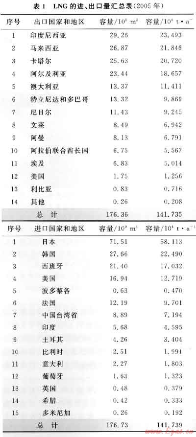 2003年全球天然氣消費量為2.6×1012m3/a,至2006年持續(xù)以1.8%的比例增加,其后又以每年2.8%的比例增長,預計2025年全球天然氣消費量將達5.1×1012m3/a。在天然氣貿(mào)易量中有7%是通過LNG的方式來進行的,表1反映了世界LNG進出口國家和地區(qū)的進出口量[1]。