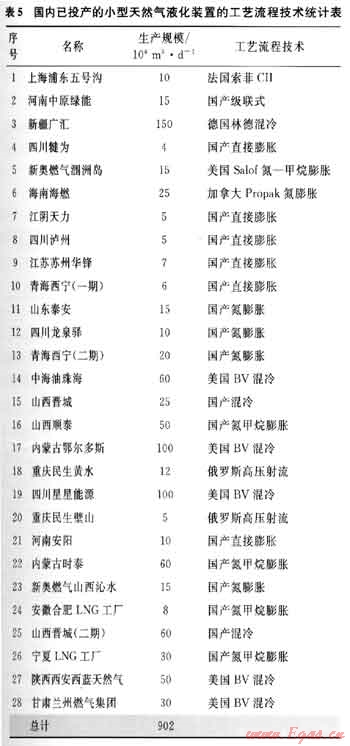 我國已建成投產(chǎn)的LNG工廠中,一部分采用了國外的流程工藝技術,如美國的B&V、Salof、ACPI,法國的Sole,德國的Linde等;另一部分則采用了國內(nèi)自行開發(fā)的技術,如河南中原綠能高科有限責任公司、成都深冷空分設備工程有限公司、中國科學院理化技術研究所等的流程工藝。目前,國產(chǎn)液化工藝包日趨成熟,單條生產(chǎn)線的規(guī)??蛇_60×104m3/d(LNG年產(chǎn)量為16×104t)。國內(nèi)已投產(chǎn)的小型天然氣液化裝置的工藝流程技術統(tǒng)計情況如表5所示[4]。