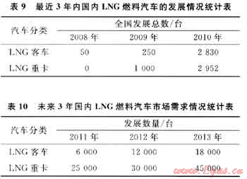 近年來,我國LNG燃料汽車已進入了快速發(fā)展通道,在短短的3年時間內(nèi),國內(nèi)已經(jīng)有新疆、山西、內(nèi)蒙古等地的LNG重型卡車及北京、杭州、深圳、烏魯木齊、昆明、???、湛江、張家口等城市LNG公交相繼投入了運行,而且這一城市群體還在迅速擴大,充分說明了LNG燃料汽車的技術已經(jīng)完全成熟、節(jié)能減排優(yōu)勢明顯。表9、10分別反映了最近3年內(nèi)國內(nèi)LNG燃料汽車的發(fā)展情況及未來3年汽車市場需求情況[5]。
