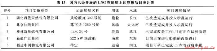 2009年4月,全球首套LNG船用燃料儲存供氣系統(tǒng)由張家港富瑞特種裝備股份有限公司下屬的控股子公司張家港韓中深冷科技有限公司研發(fā)試制成功并順利交付客戶挪威漢姆沃斯公司。同時,在國內(nèi)LNG船舶油改氣項目也有了長足的發(fā)展。截至目前,已經(jīng)先后有湖北西籃、北京油陸、桂林新奧燃氣、新疆廣匯、福建中閩等多家能源企業(yè)為了搶占LNG在船舶領域的應用市場而開展了船舶燃料油改氣示范項目的運作(表13)。