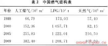 我國將天然氣發(fā)展視為一項能源結構調(diào)整和大氣環(huán)境改善的重要舉措。中國城市燃氣進入了天然氣階段,20世紀90年代末至21世紀初,中國建設了一批天然氣輸送工程,推動了城市燃氣的發(fā)展——城市燃氣普及率提高、燃氣結構發(fā)生了很大變化(表2)[3]。