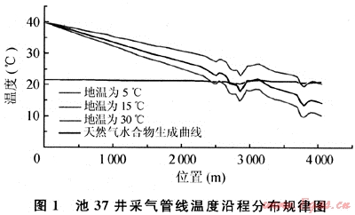 圖1為池37井在井口溫度為40℃時,不同地溫下的沿程溫度分布及天然氣水合物生成曲線圖。從圖上可以看到管線高程對管線沿線壓力、溫度影響非常大,而且隨著管線位置變化,壓力的變化引起各點的天然氣水合物生成溫度也發(fā)生了變化。管線進(jìn)站溫度最低,并不是在此處形成的天然氣水合物溫度最低,因此進(jìn)行管線設(shè)計時要綜合考慮預(yù)測天然氣水合物形成溫度,不能僅以終點不形成天然氣水合物,就認(rèn)為管線沿程都不生成天然氣水合物。