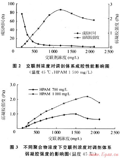 由圖1可見(jiàn),聚合物濃度增加,體系成膠時(shí)間縮短。同時(shí)形成的弱凝膠強(qiáng)度隨著HPAM濃度的增加而增強(qiáng)。但當(dāng)HPAM濃度大于2000mg/L時(shí),雖然凝膠強(qiáng)度增加到1Pa以上(按凝膠強(qiáng)弱分級(jí)為較強(qiáng)凝膠),但成膠時(shí)間縮短到10h以下,這在大劑量深部處理時(shí)易導(dǎo)致前期調(diào)剖劑段塞反應(yīng)太快而使后面的調(diào)剖劑注入困難。此外,HPAM濃度越高,調(diào)剖體系溶液越黏稠,配制及注入都相對(duì)要困難些。在弱凝膠強(qiáng)度及性能滿足作業(yè)要求條件下,低濃度可獲得較低的成本。但濃度不能低于400mg/L,因?yàn)镠PAM濃度在400mg/L以下時(shí)弱凝膠強(qiáng)度很弱,穩(wěn)定1~2周后有少量的游離水,但弱凝膠HPAM濃度在500mg/L以上時(shí),形成的弱凝膠性能則穩(wěn)定。