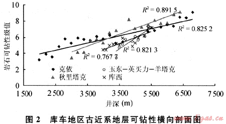由圖3所示,庫車地區(qū)白堊系地層可鉆性級值克依構(gòu)造區(qū)帶與秋里塔克構(gòu)造區(qū)帶較大,主要分布在6~9級,屬于難鉆地層,而玉東-英買力-羊塔克地層可鉆性級值主要分布在5~8級;從回歸分析趨勢來看,克依構(gòu)造與秋里塔克構(gòu)造增加趨勢相近,玉東-英買力-羊塔克地層與庫西地區(qū)增加趨勢相近,但增加趨勢大于前兩者;從擬合數(shù)值來看,克依構(gòu)造地層可鉆性級值最大,秋里塔克次之,再次為庫西地區(qū),玉東-英買力-羊塔克構(gòu)造區(qū)帶最小,只有在井深達(dá)到6000m左右,4個構(gòu)造區(qū)帶地層可鉆性級值才較為接近。