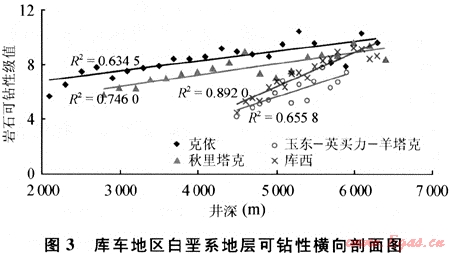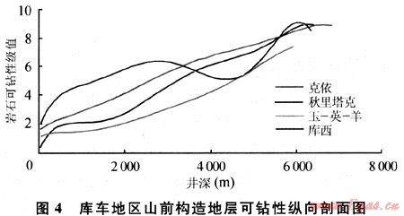 在古近系到白堊系,庫西地區(qū)地層可鉆性地層可鉆性較上部地層變小,與其他3個構(gòu)造區(qū)帶地層可鉆性變化趨勢相反,而其他3個構(gòu)造區(qū)帶地層可鉆性隨井深增加而有所增加。