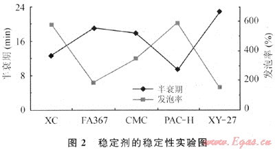 根據(jù)實驗結果,穩(wěn)定劑CMC的加入對發(fā)泡率的影響較小,且具有良好的穩(wěn)定能力;XC和PAC-H的加入雖然提高了半衰期,但發(fā)泡率較低;FA367和XY-27的穩(wěn)定能力差。實驗最終優(yōu)選CMC作為體系的穩(wěn)定劑。