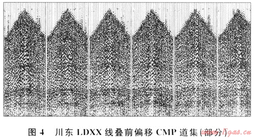 抽取該剖面段的部分輸入道集(圖4為LDXX線偏移前CMP道集),可見信噪比較高,有清楚的反射雙曲線。但仔細(xì)對比分析,在道集中局部存在大的振幅值。Kirchhoff疊前時(shí)間偏移方法,本質(zhì)是繞射求和。這些大的振幅值或尖脈沖在積分求和的偏移過程中,展開的算子不能被相鄰的其他算子抵消,在偏移剖面上表現(xiàn)為畫弧現(xiàn)象。因此,道集中的噪聲是疊前時(shí)間偏移成像變差的因素之一。
