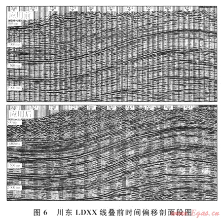 疊前時(shí)間偏移輸入數(shù)據(jù)為每個(gè)炮檢距的信息,沒有零炮檢距的假設(shè),避免了由于共中心點(diǎn)NMO校正疊加所產(chǎn)生的畸變,是構(gòu)造復(fù)雜、橫向速度變化不大地區(qū)成像處理較理想的偏移方法。疊前時(shí)間偏移輸出的CRP道集信息,可以為巖性勘探中油氣的定量檢測提供更好的手段。該偏移技術(shù)已廣泛地應(yīng)用于四川油氣田勘探中,成為常規(guī)的資料處理偏移手段[6]。