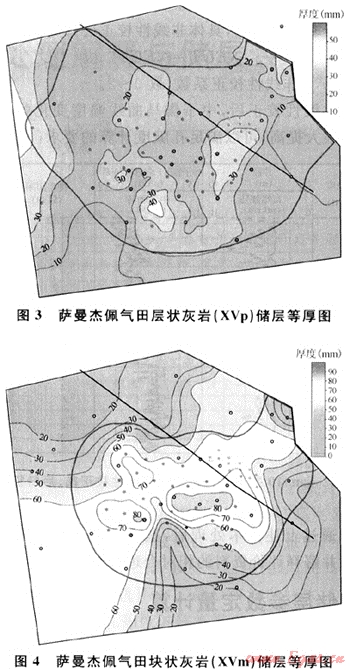 在儲(chǔ)層橫向?qū)Ρ鹊幕A(chǔ)上,編制了層狀灰?guī)r(XVp)、塊狀灰?guī)r(XVm)有效儲(chǔ)層等厚圖(圖3、4),層狀灰?guī)r有效儲(chǔ)層厚度0~20m,不完全受構(gòu)造控制,在Sam-17、Sam-15、Sam-6井區(qū)還受巖性控制;總體上高值區(qū)位于構(gòu)造高部位,同時(shí)在構(gòu)造高部位又分為東、西兩個(gè)高值區(qū)(厚度大于15m),而中部有一個(gè)較明顯的低值區(qū)。塊狀灰?guī)r有效儲(chǔ)層厚度0~90m,完全受構(gòu)造控制。高值區(qū)位于構(gòu)造高部位,最厚區(qū)在Sam-123~Sam-51~Sam-53井一線(厚度大于70m)。