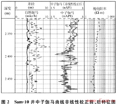 非線性校正后,中子伽馬曲線幅度變化的靈敏性有很大提高,可以滿足孔隙度計(jì)算的要求(圖2)。