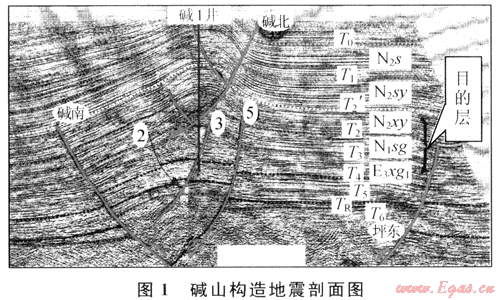 堿山構(gòu)造新近系自晚燕山運(yùn)動以來,先后經(jīng)歷了多次喜山運(yùn)動[7]。強(qiáng)烈的擠壓構(gòu)造運(yùn)動,一方面在本區(qū)形成了背斜構(gòu)造,為天然氣的聚集提供了可能的場所,但另一方面構(gòu)造運(yùn)動形成的斷裂,會破壞構(gòu)造的完整性,將構(gòu)造分割成不同的斷塊,不利于天然氣的聚集,其中堿北斷裂斷至地表,對成藏極為不利。堿山構(gòu)造淺層與深層以T3為界分成兩部分,深層構(gòu)造受早期高角度逆沖斷層控制,在剖面上表現(xiàn)為兩斷夾一隆基底卷入型構(gòu)造樣式;淺層構(gòu)造受淺層滑脫斷層即堿北斷層控制,形成蓋層滑脫型構(gòu)造樣式(圖1)。