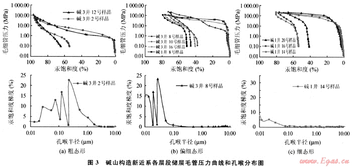 儲層孔隙結(jié)構(gòu)分為粗態(tài)型、偏細(xì)態(tài)型和細(xì)態(tài)型3種類型,整體排驅(qū)壓力較高(圖3),儲層主要流動喉道半徑較小,喉道孔徑主要分布在小于0.1μm的范圍,屬小孔-微細(xì)喉型,喉道系統(tǒng)較復(fù)雜,均勻程度差,分選不好,孔喉比大,喉道相當(dāng)彎曲,因而排驅(qū)壓力和飽和度中值壓力高,退出效率低,充分表明儲層孔隙結(jié)構(gòu)差,故儲層滲透能力差,為差儲集層,不利于油氣的運(yùn)聚。從縱向上整體來看滲流能力由上向下逐漸變差(表2)。根據(jù)裘亦楠、王允誠等確定的砂巖儲層分類評價方案所示,表明堿山構(gòu)造各儲層屬Ⅱ3-Ⅳ類儲層,即中下等到很差-差類儲層,這也是該區(qū)沒有形成規(guī)模聚集的主要原因之一[8~9]。