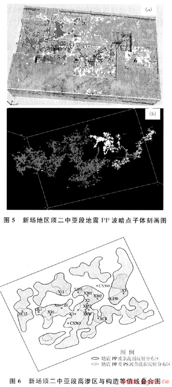 圖5-a為通過基于小波變換的多尺度吸收增強(qiáng)處理后不同暗點(diǎn)子體在不同時(shí)窗上的可視化立體顯示圖[14],可以看出,宏觀上須二段中部存在5~6個(gè)吸收異常子體,各子體存在于不同的時(shí)間段(或深度范圍),圖5-b為利用像素成像技術(shù)Texture屬性對暗點(diǎn)進(jìn)行的空間可視化刻畫圖,雜亂反射得以清晰刻畫。