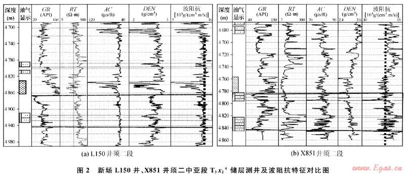 X856、X2井在T3x24層測試獲日產(chǎn)50×104m3以上高產(chǎn)工業(yè)氣流,為典型高產(chǎn)井,這樣的產(chǎn)能在陸相碎屑巖氣藏中亦較為少見,該類高產(chǎn)井優(yōu)質(zhì)儲(chǔ)層厚度大(20~30m),孔隙度高(一般大于4%),通過錄井次生礦物識(shí)別、成像測井解釋等證實(shí)裂縫極為發(fā)育,規(guī)模裂縫網(wǎng)絡(luò)及相對厚層優(yōu)質(zhì)儲(chǔ)層發(fā)育,為典型高效儲(chǔ)滲體特征。儲(chǔ)層具有Ⅱ類中等波阻抗特征,由于儲(chǔ)層與圍巖阻抗接近,波阻抗差小,地震反射強(qiáng)度較弱,利用合成地震記錄對X856、X2井須二段開展儲(chǔ)層精細(xì)標(biāo)定,產(chǎn)層T3x24對應(yīng)空白弱反射。L150井、X853井為2口低產(chǎn)井,日產(chǎn)氣量均在5×104m3左右,儲(chǔ)層為典型的工類高阻抗儲(chǔ)層,該類井往往優(yōu)質(zhì)儲(chǔ)層厚度相對較薄(不超過10m),且裂縫網(wǎng)絡(luò)欠發(fā)育,儲(chǔ)層與上覆低阻抗泥巖波阻抗差異大,地震剖面對應(yīng)中強(qiáng)振幅,儲(chǔ)層頂界對應(yīng)強(qiáng)波峰,大部分須二段儲(chǔ)層及超致密砂巖均具有此類特征。
