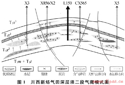 此外,在具有極強(qiáng)非均質(zhì)性的致密碎屑巖氣藏中,裂縫系統(tǒng)具有極端重要性,加上超低滲致密砂巖及泥巖夾層縱橫向極強(qiáng)的分隔和封蓋能力,構(gòu)造圈閉線不代表氣藏邊界,斜坡區(qū)域亦可能發(fā)育高效儲(chǔ)滲區(qū)(圖1),因此,構(gòu)造翼部雜亂反射區(qū)亦是勘探需要探索的重要區(qū)域。正是基于此,勘探實(shí)踐中創(chuàng)新部署思路,XC8井就部署于X856井南翼構(gòu)造圈閉線以外的高滲區(qū),該井目前已獲成功,該區(qū)域勘探已向斜坡邁進(jìn),這同時(shí)極大地拓展了川西深層裂縫性致密碎屑巖氣藏勘探開發(fā)領(lǐng)域。