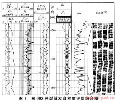將上述評價裂縫發(fā)育程度指標(biāo)的計算模型和參考文獻[1]所述巖石力學(xué)動靜態(tài)轉(zhuǎn)換關(guān)系式編制成Fortran語言,掛接在Forward測井解釋平臺上,實現(xiàn)單井逐點可視化處理。對工區(qū)內(nèi)10多口具有成像測井資料和巖心描述的井進行了裂縫發(fā)育程度指標(biāo)處理,圖1為白005井裂縫發(fā)育程度評價綜合成果圖。由圖1不難發(fā)現(xiàn),630~652m井段,完整性系數(shù)值較低、裂縫發(fā)育程度指標(biāo)值較高、巖石穩(wěn)定系數(shù)值偏低,從所對應(yīng)的成像測井圖上可以看出,該段斜交縫和網(wǎng)狀縫較為發(fā)育,巖心描述為半充填的低角度和網(wǎng)狀縫。從工區(qū)內(nèi)其他井的處理情況來看,處理結(jié)果與成像測井和巖心描述對應(yīng)性都較好。因此,筆者所述方法對研究工區(qū)火山巖裂縫發(fā)育程度評價較為有效。