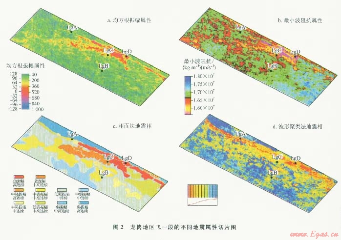 地震相識(shí)別技術(shù)采用了相面法定性分析和波形聚類半定量分析,利用這兩種地震相識(shí)別技術(shù)對(duì)飛仙關(guān)組鮞粒灘體進(jìn)行預(yù)測(cè),認(rèn)為用相面法來(lái)劃分地震相能粗框架的限定鮞粒灘體的發(fā)育部位(圖2-c),再有針對(duì)性地對(duì)灘體發(fā)育部位利用波形聚類法進(jìn)行地震相劃分(圖2-d)能更精細(xì)地識(shí)別灘體。