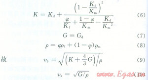 式中K為飽含孔隙流體巖石的等效體變模量;G為飽含孔隙流體巖石的等效剪切模量;ρ為飽含孔隙流體巖石的等效密度;Kd為巖石骨架體變模量;Gd為巖石骨架剪切模量;Km為巖石基質體變模量;ρm為巖石基質的密度;Kf為孔隙流體的體變模量.ρf為飽含流體的密度;φ為巖石孔隙度;νp為飽含孔隙流體巖石的縱波速度;νs為飽含孔隙流體巖石的橫波速度。