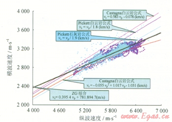 根據這些關系式的原理,在塔中地區(qū),通過實測的縱橫波數據擬合出適合本區(qū)的縱橫波關系式,用以進行橫波估算。即